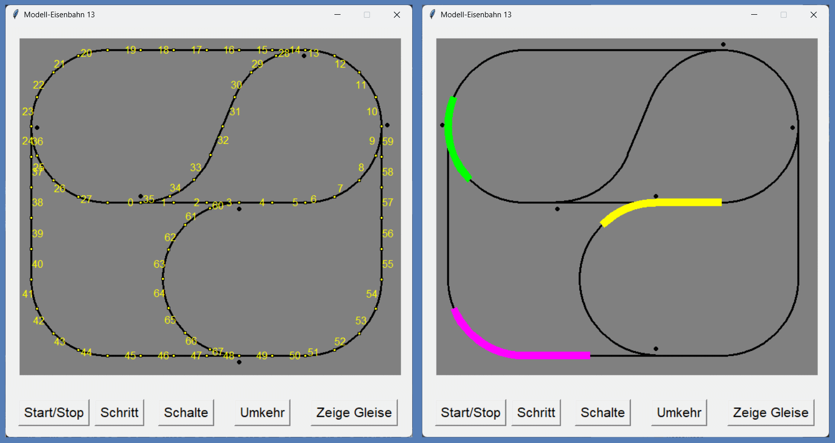 Ursprünglich sollte dies ein Projekt für meine Python-AG werden, doch stellte sich heraus, dass die notwendige Komplexität schulische Begrenzungen weit übersteigt. Aber es ist eine Basis entstanden, auf der man komfortabel seine eigenen Vorstellungen von Gleislaufplänen, Zugsteuerungen, Signalisierungen, Fahrplänen und Sicherungsvorkehrungen realisieren kann – wenn man sich mit Python halbwegs zuhause fühlt. Den Code inklusive Dokumentation gibt es hier zum runterladen.