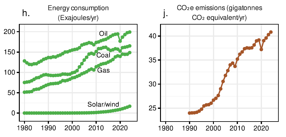 Aber lest selbst! Habe ich mich in den letzten Monaten über den rasanten, ja exponentiellen Anstieg im Bereich Solar und Wind zur Stromerzeugung weltweit gefreut, so muss ich doch leider feststellen, dass dies dem Wachstum bei der Nutzung fossiler Brennstoffe insgesamt bislang keinerlei Abbruch getan hat, wie in Figure 1 h. zu erkennen ist. Und dem entsprechend nahmen und nehmen auch die jährlichen CO2-Emissionen immer noch zu, anstatt drastisch abzusinken, wie es ein rechtzeitiges Abbremsen besagten Tankers erfordert. (Figure 1 j.)